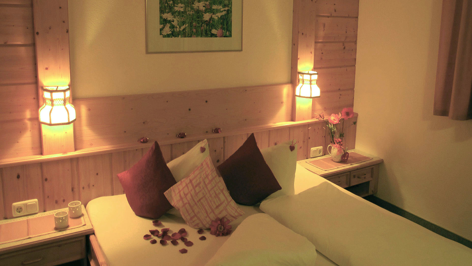 Alpiner Charme und wohlige Geborgenheit zeichnen diese Wohnung aus. Ein gemütliches, individuelles Schlafzimmer mit großem Fichtenholzbett.