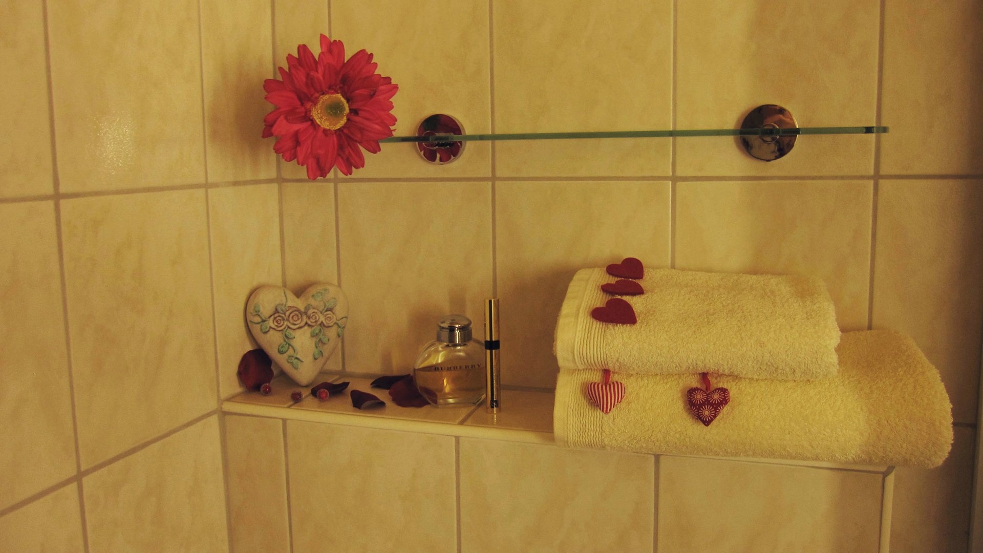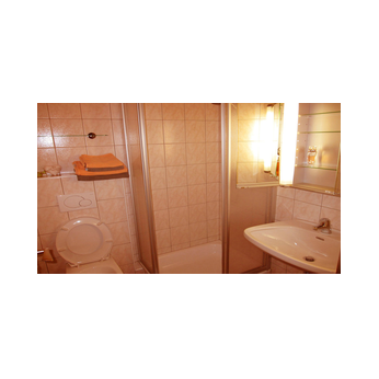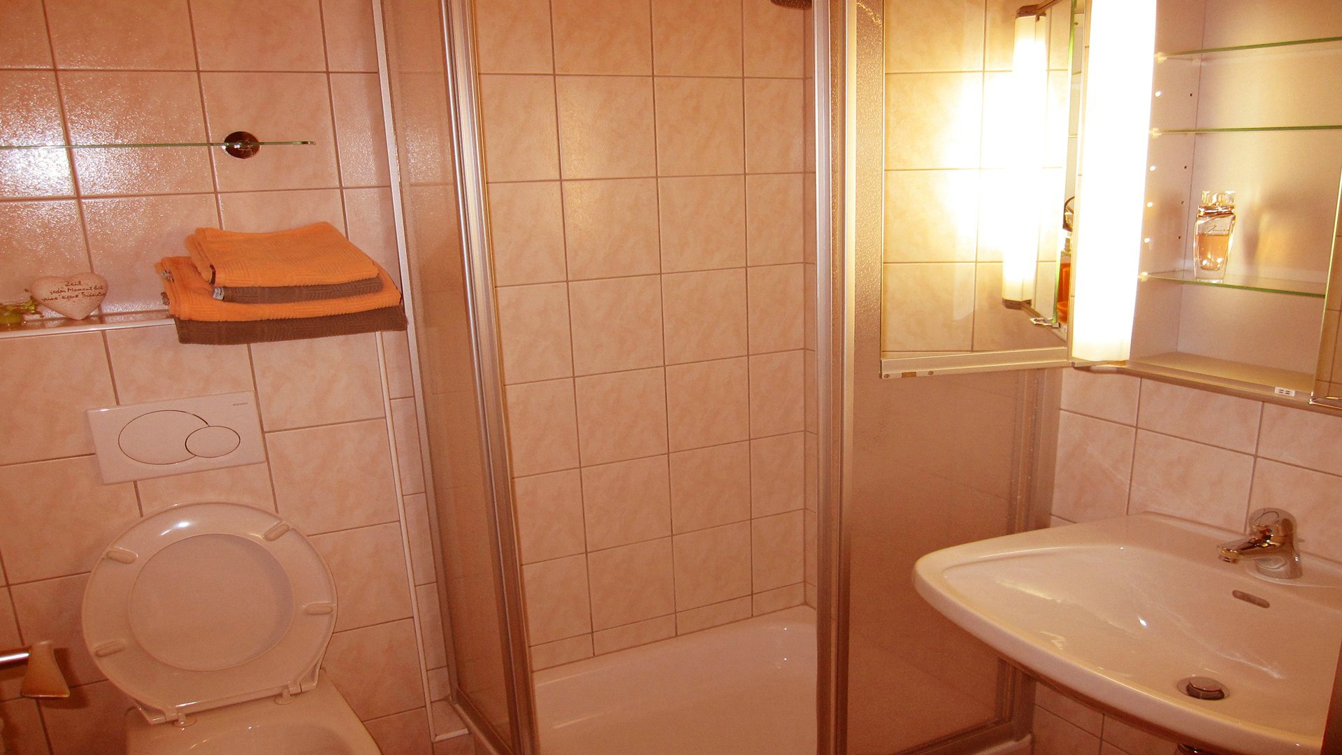 Das Badezimmer mit großem Kosmetikspiegel,WC,Fön,Dusche und was noch so dazu gehört.