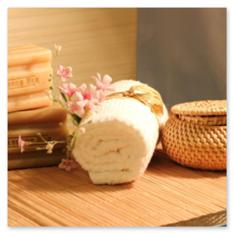 (mit frischen Handtüchern und Bademantel)